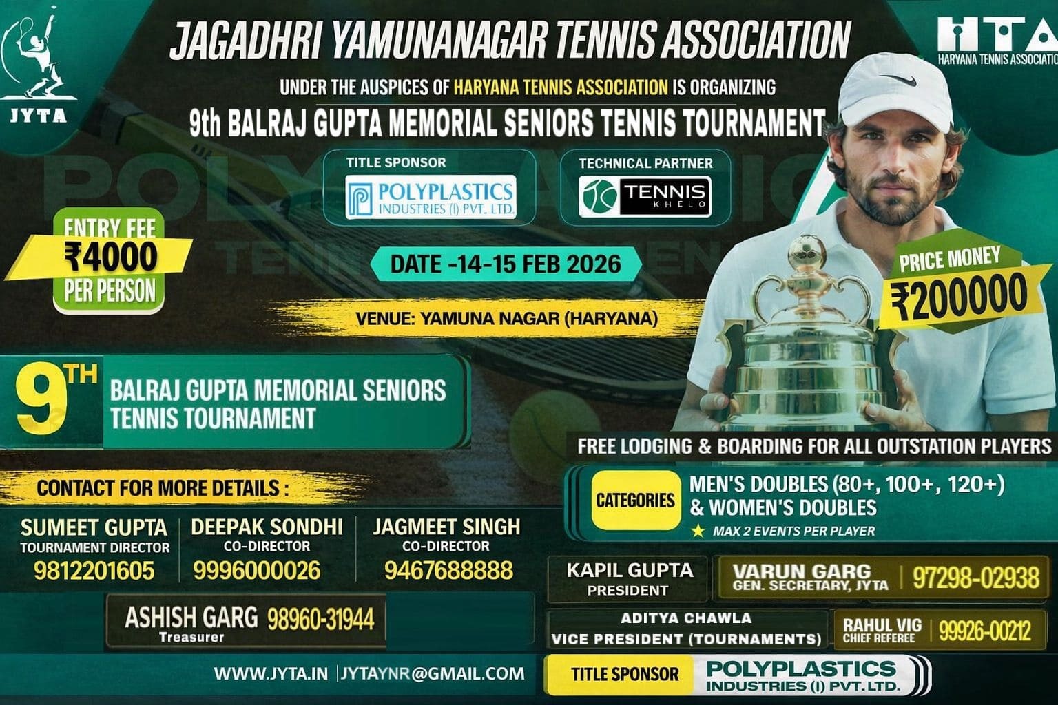 Formed under prime leadership of Founder President , Mr. Darshan Lal Garg, Jagadhri Yamunanagar Tennis Association finds it roots way back in the year 1974.